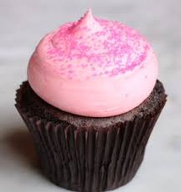 a chocolate cupcake with a chocolate syrup filling topped a plain buttercream icing